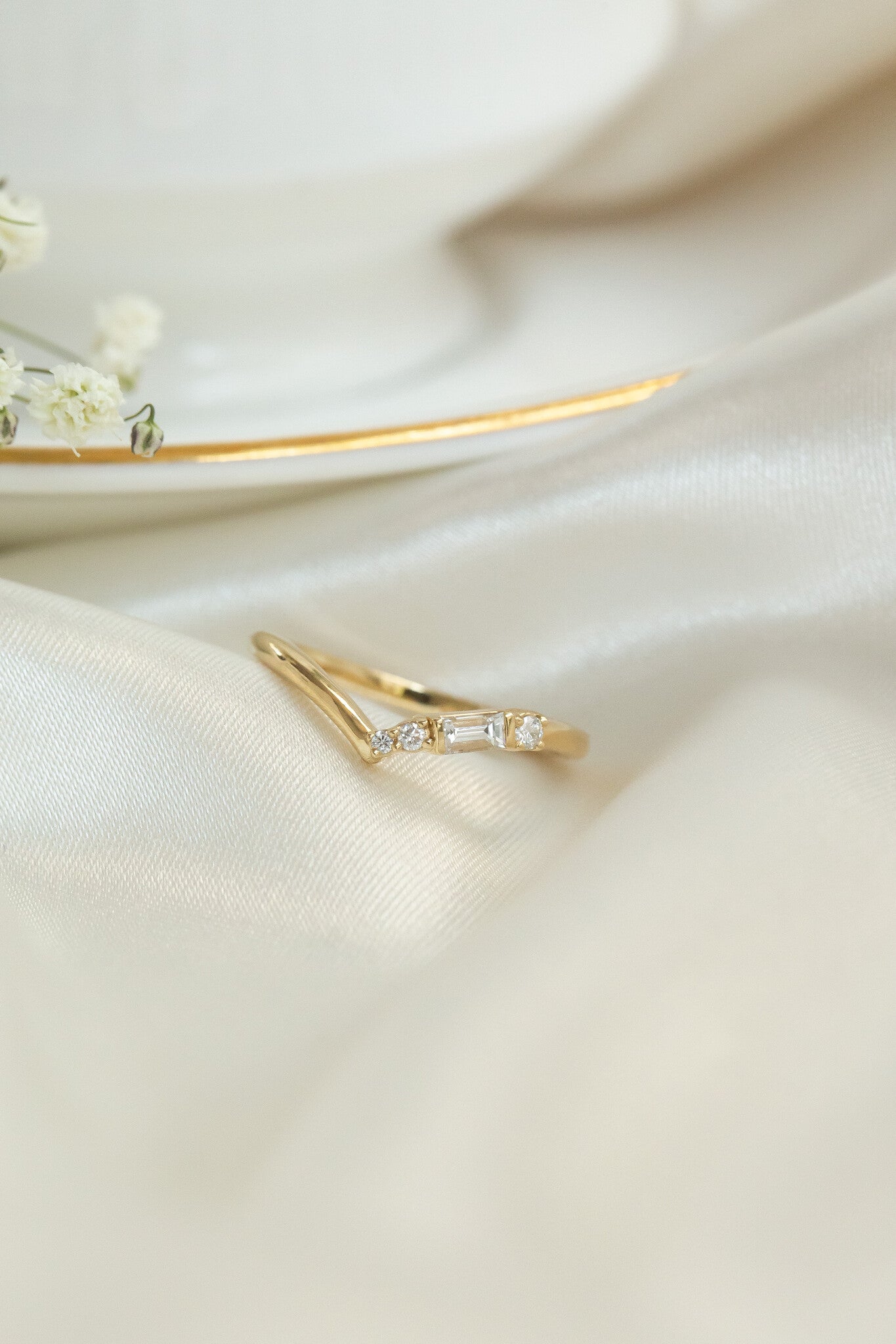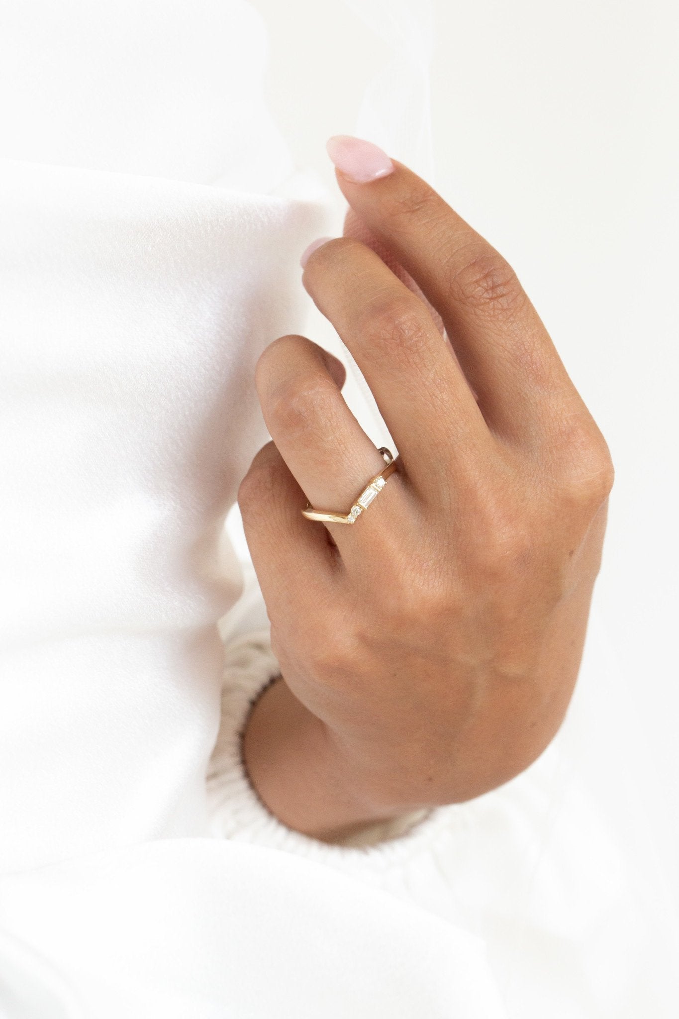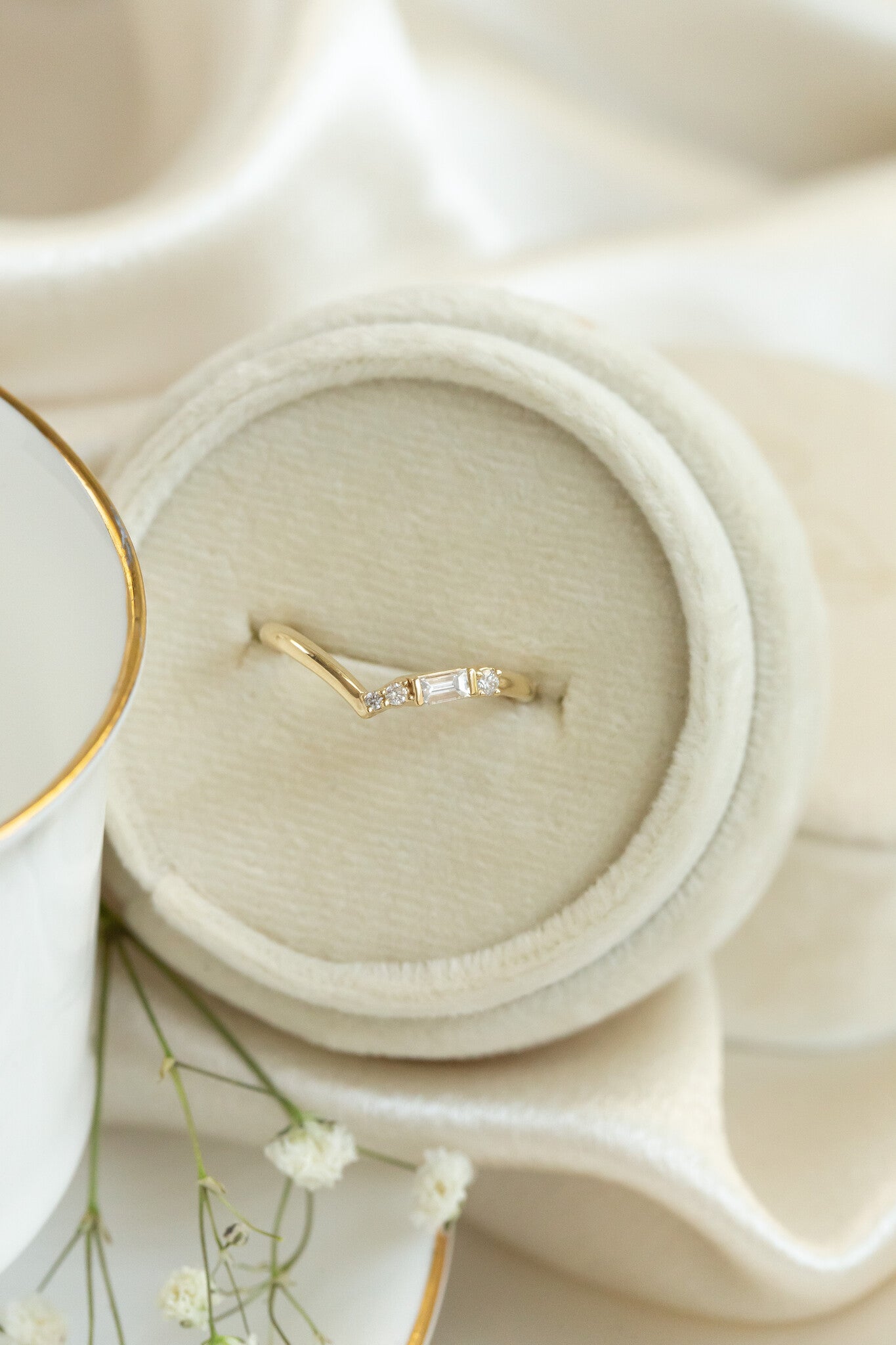 The Wisteria Tracer Band features .17 ct baguette and round diamonds in prongs, offset on one side of this v tracer band.
