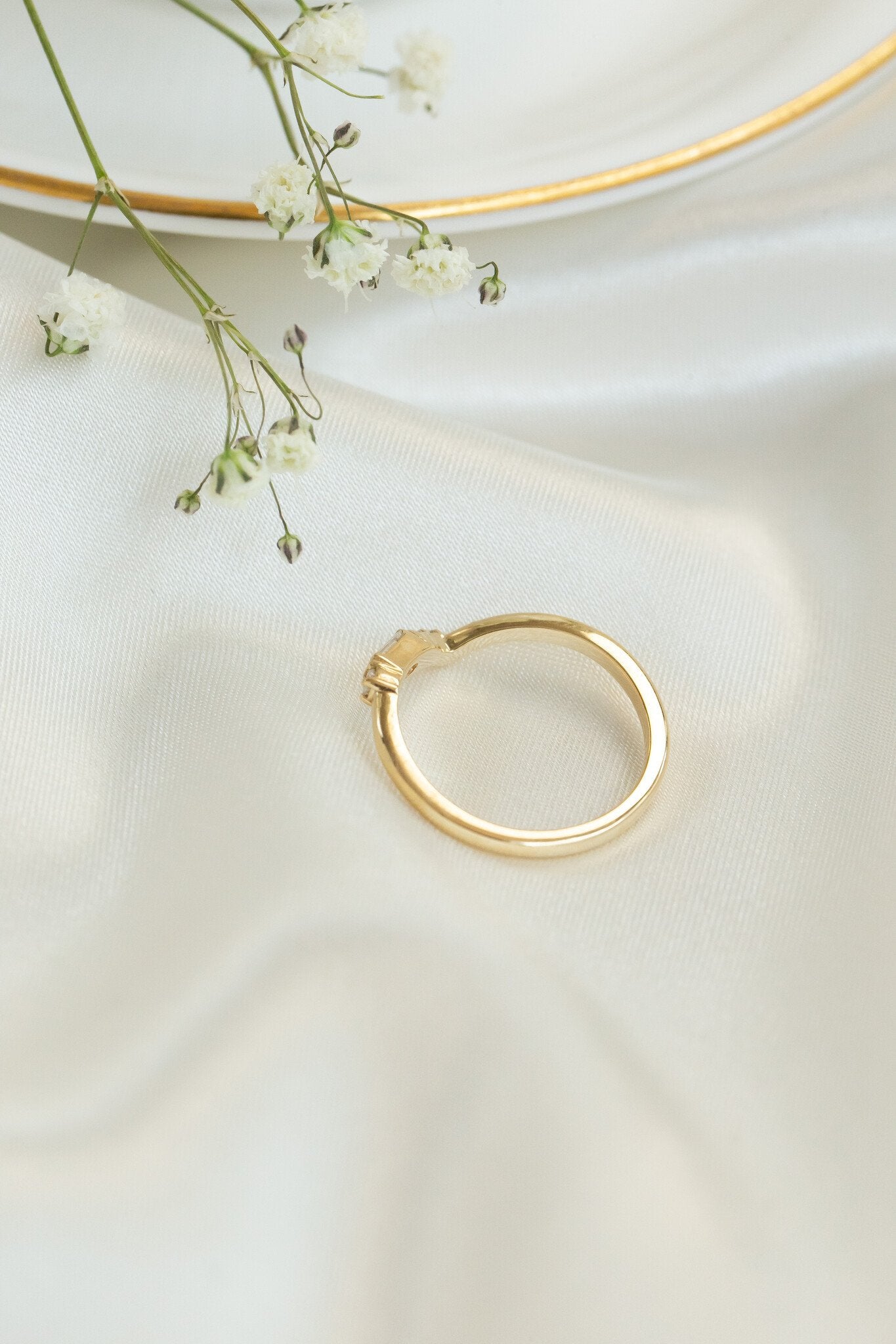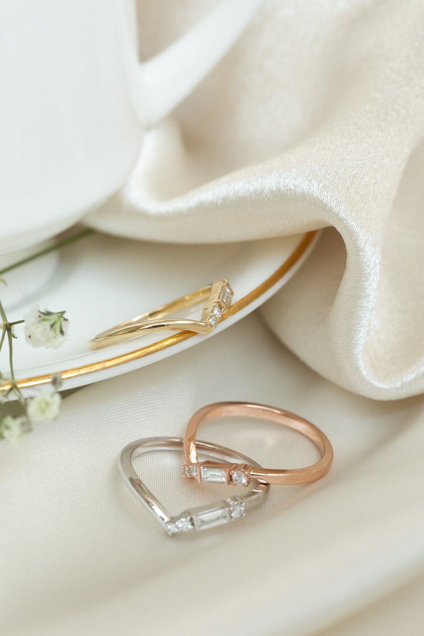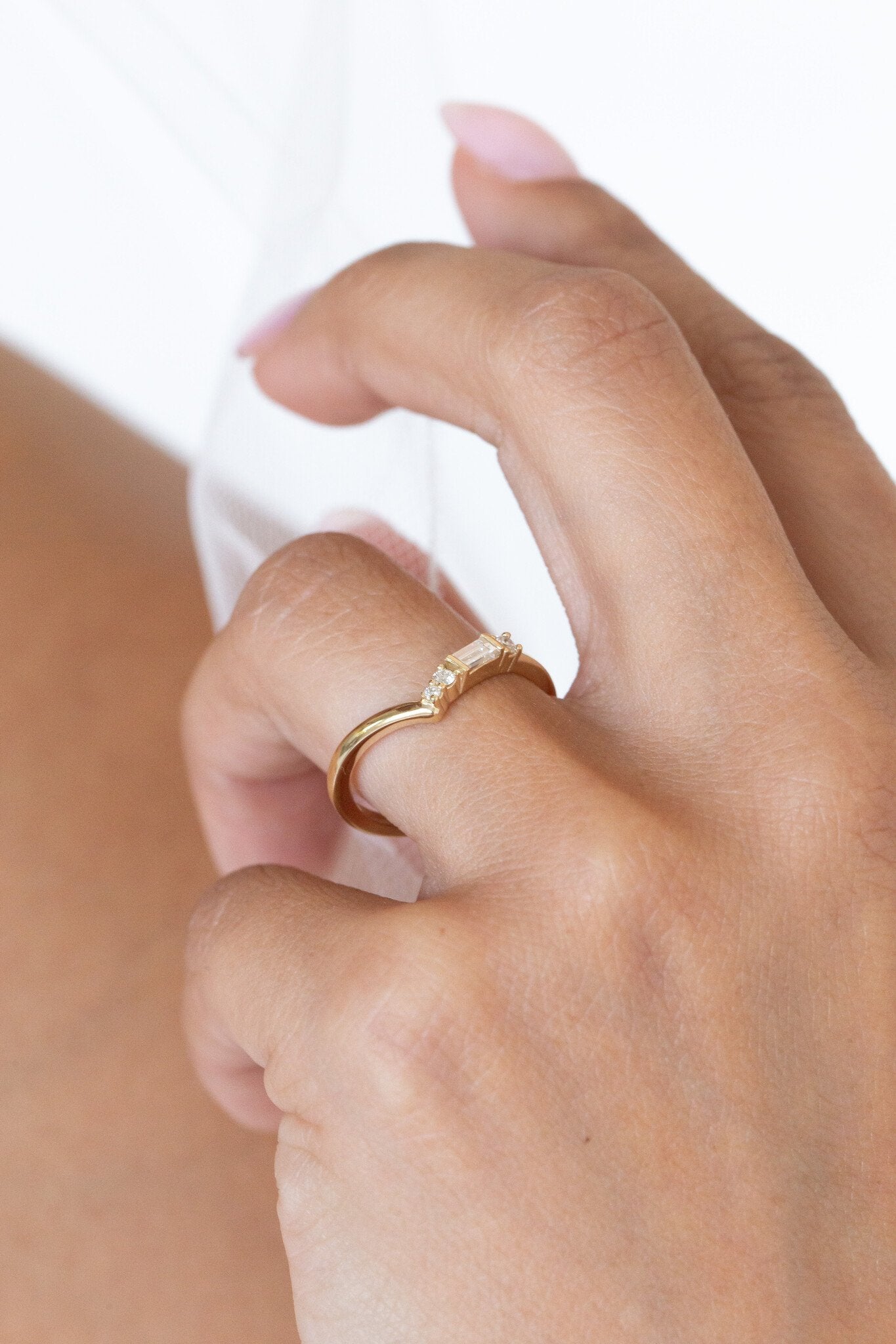 The Wisteria Tracer Band features .17 ct baguette and round diamonds in prongs, offset on one side of this v tracer band.