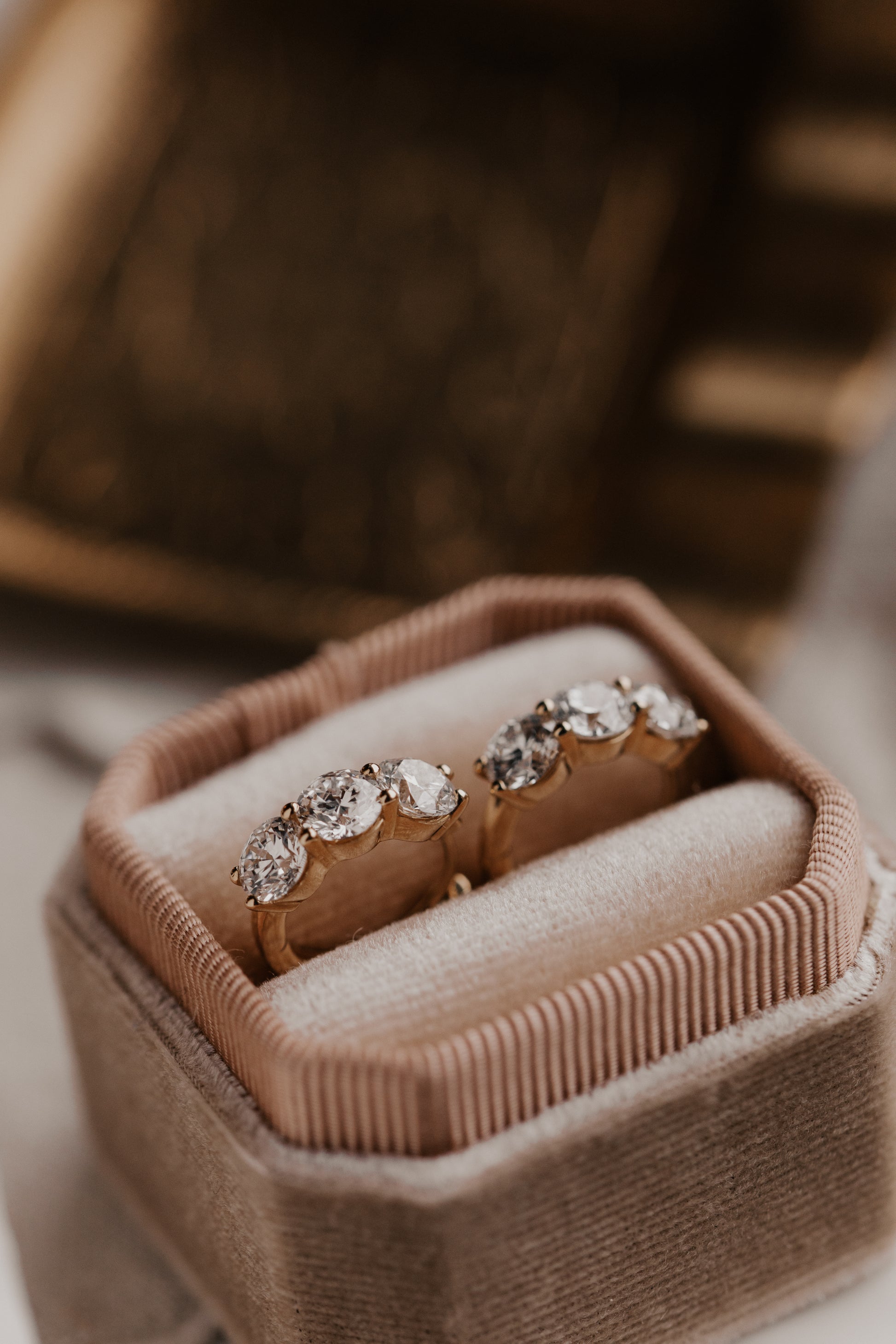 These 14k gold earrings feature round lab grown diamonds set in prongs with a hinged clasp design.