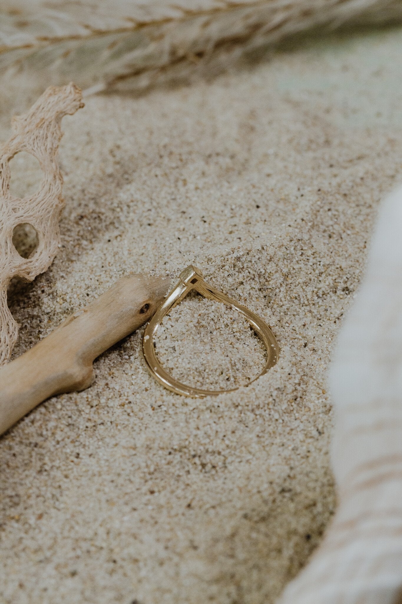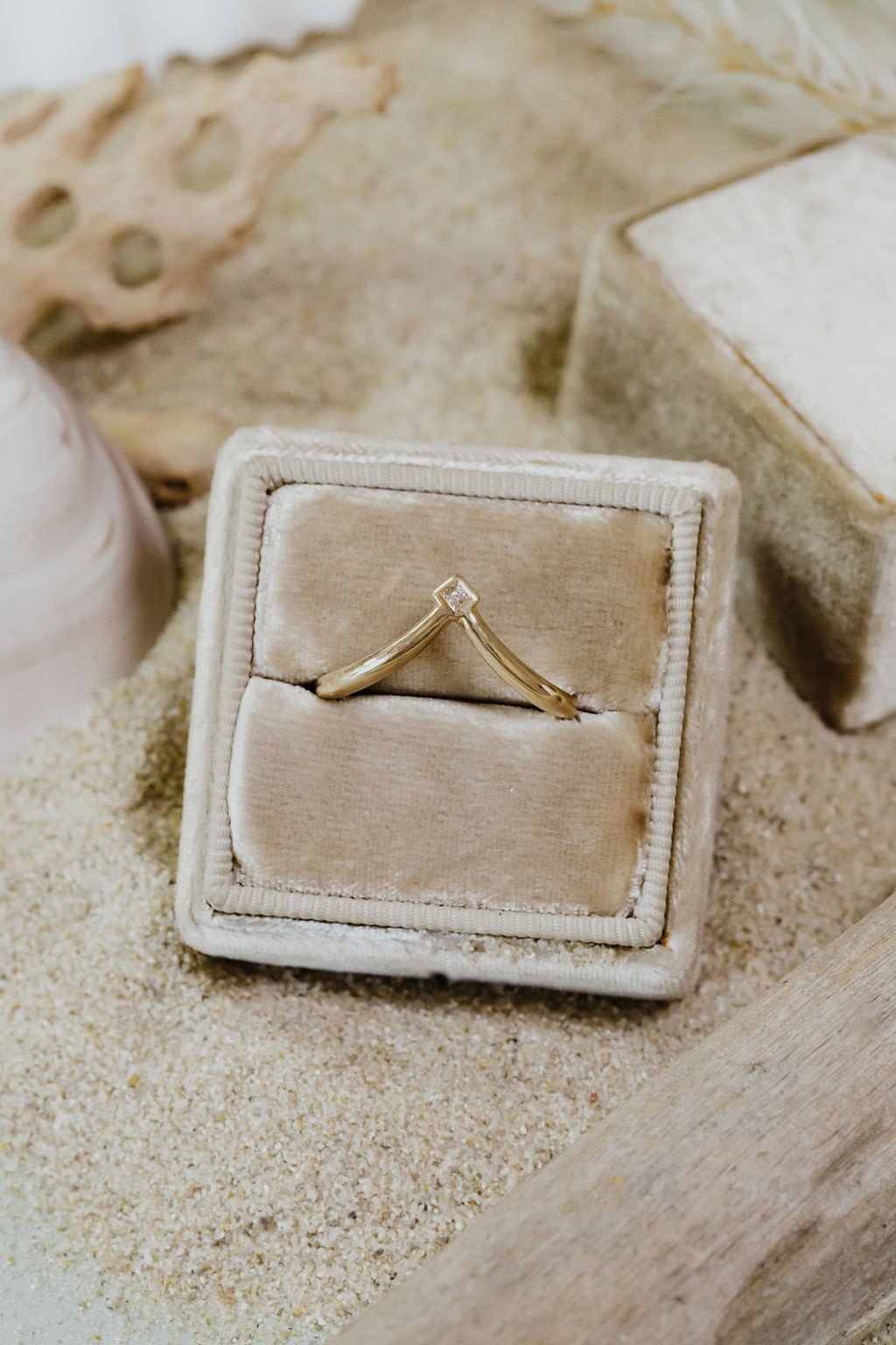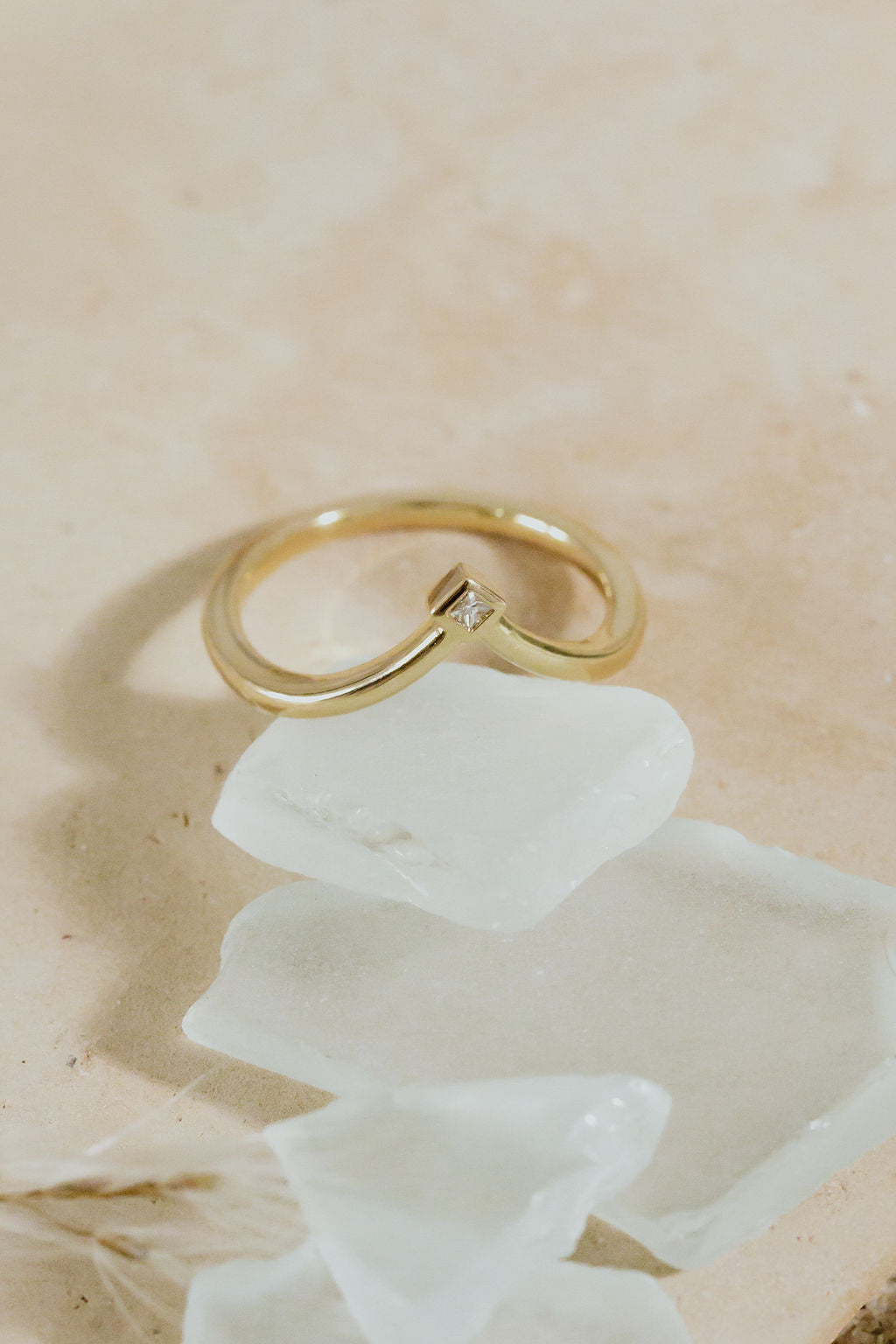 The sharply angled diamond gives a completely different look to an V tracer band, like a conch shell peeking out from the golden sand.