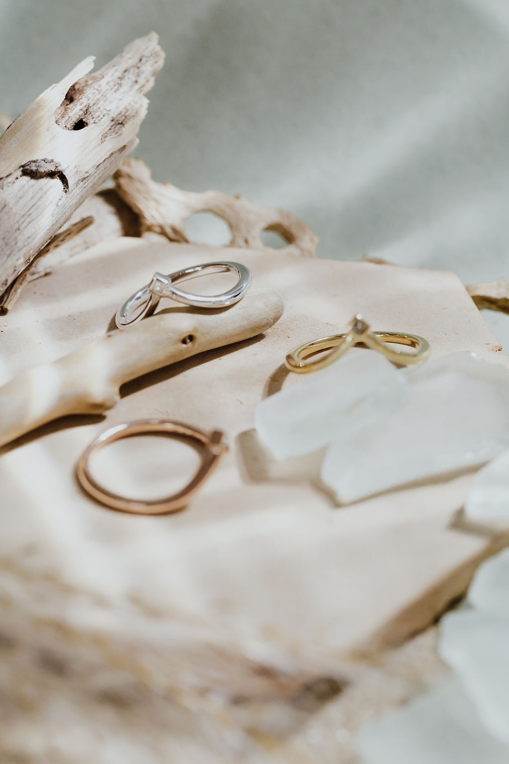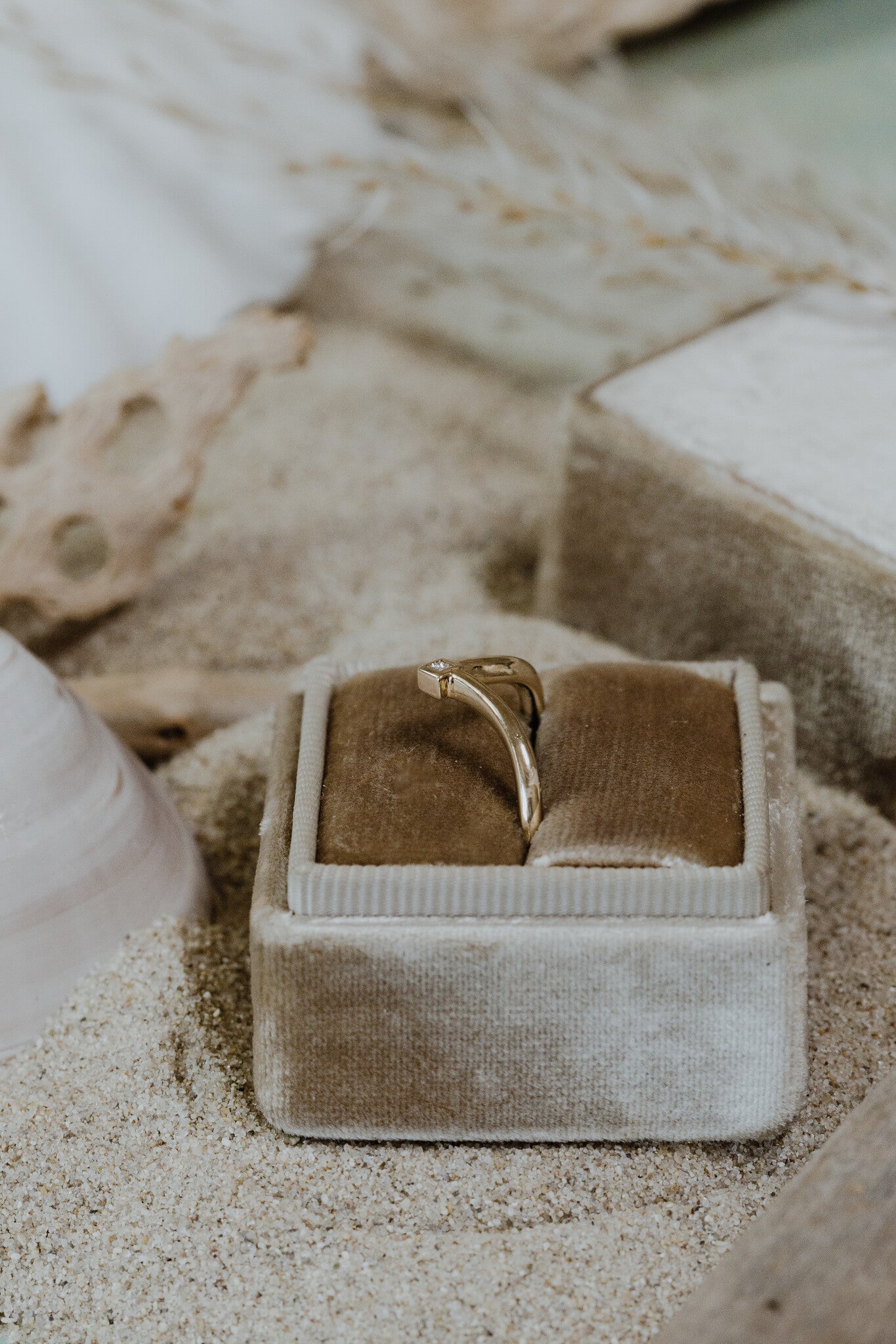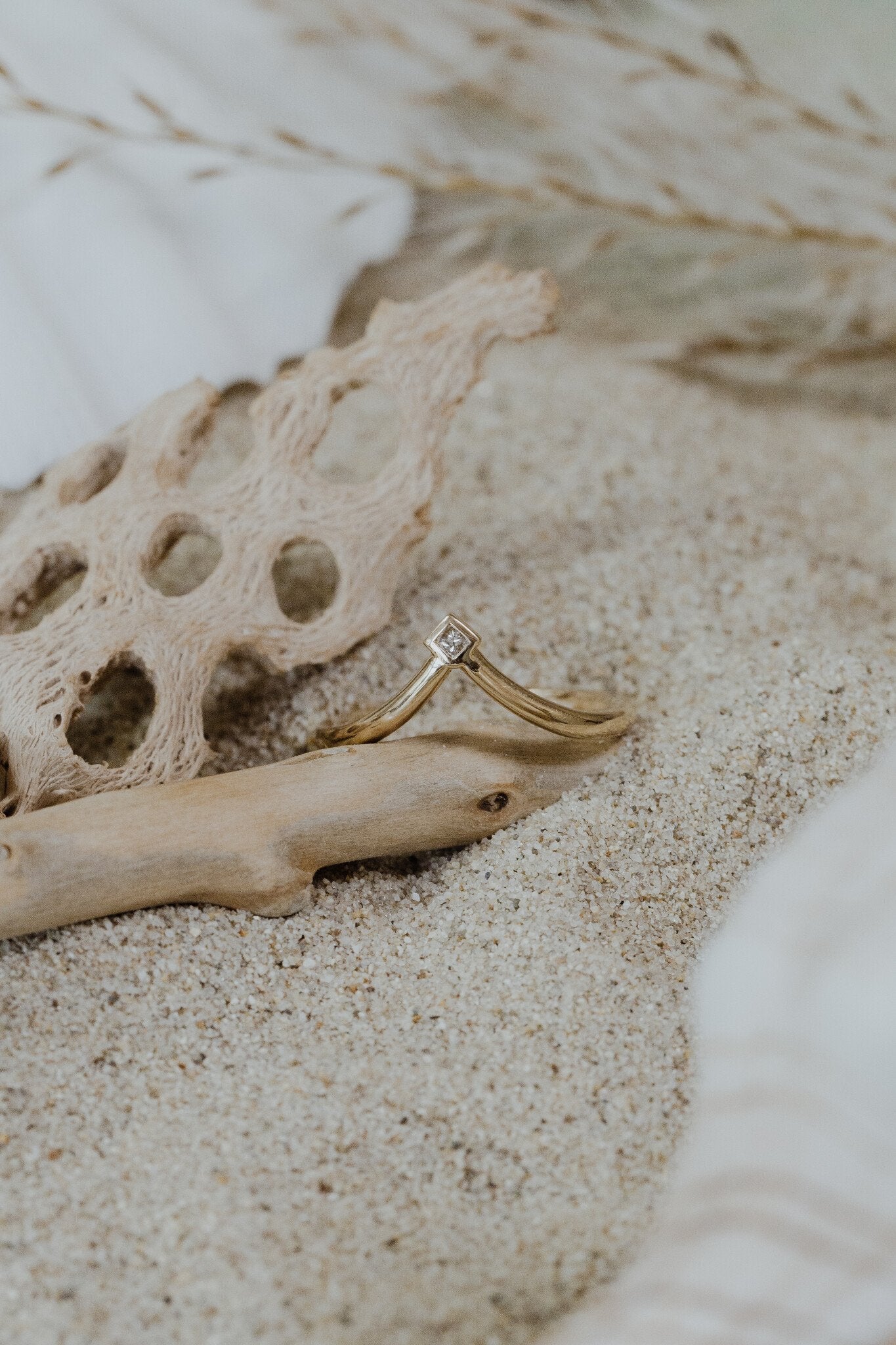 The sharply angled diamond gives a completely different look to an V tracer band, like a conch shell peeking out from the golden sand.